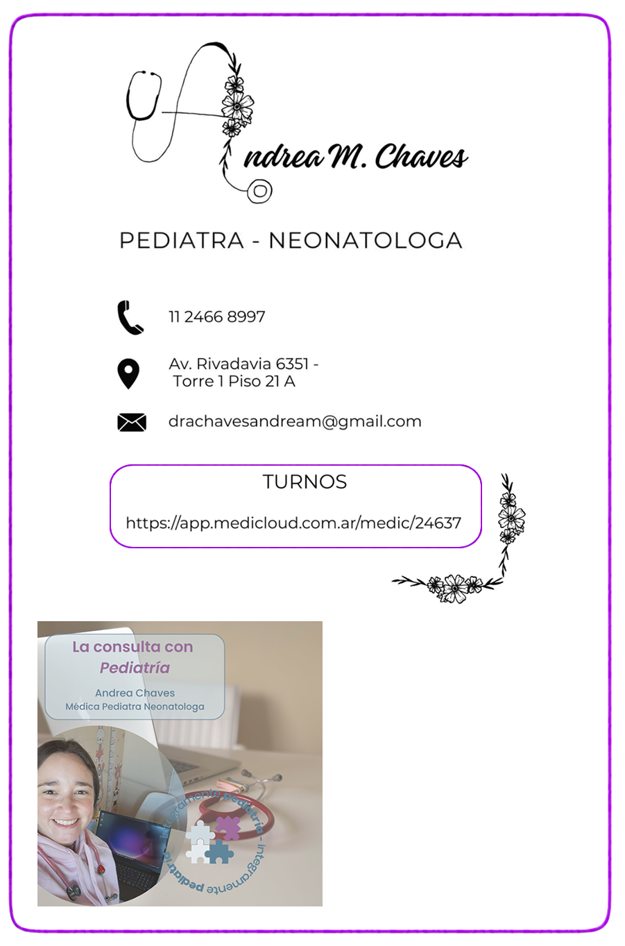 Dra. Andrea M. Chaves - Pediatra - Neonatologa - Celular: 11-2466-8997 - drachavesandream@gmail.com - Turnos: https://app.medicloud.com.ar/medic/24637 -